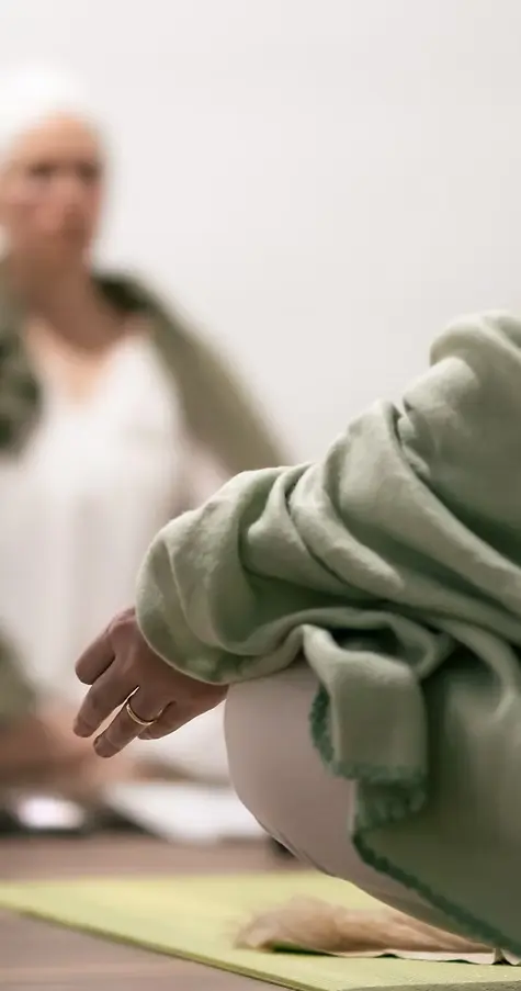 Ráhangolódás az Ong Namo Guru Dev Namo mantra éneklésével, mely által összekapcsolódunk a Felső Énnel
